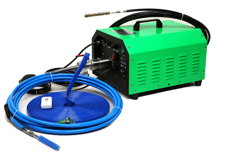 物理清洗主要是采用軟軸毛刷清洗。軟軸是靠清洗機(jī)的電機(jī)帶動(dòng)轉(zhuǎn)動(dòng)的,軟軸最前方有一根尼龍毛刷,使用時(shí)將軟軸及毛刷伸入冷凝器銅管內(nèi),通過高速旋轉(zhuǎn)前進(jìn)的毛刷來清除銅管內(nèi)的污垢,最后用清水沖洗,這種機(jī)器叫作通炮機(jī)(冷凝器通炮機(jī))。